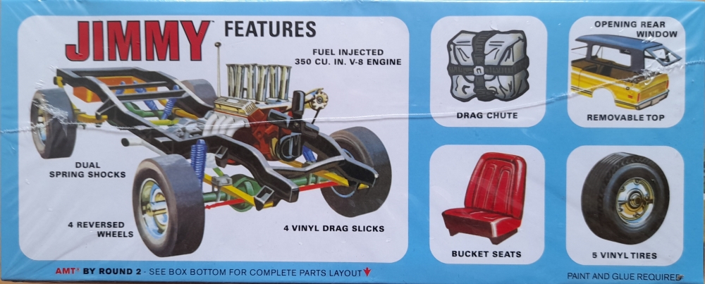 FEATURE PACKED: The Jimmy is an iconic ride with off-road style! Fully paintable, it features an expanded sheet of water-slide decals loaded with colorful options. Build it 1 of 2 ways: stock or drag. Features include stock and drag engine parts, removable roof with opening rear window, pad printed M&H Racemaster drag slicks, stock and drag wheels, and more. Wrapped up nicely in vintage-styled packaging!