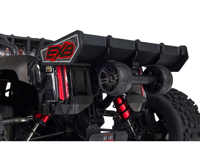 The toughness engineered into the ARRMA® OUTCAST™ 1/5 8S EXtreme Bash Stunt Truck must be bashed to be believed. A huge number of EXB-hardened parts and options give it virtually unstoppable strength straight out of the box. They include a 5mm thick EXB 7075 T6 CNC aluminum laser-etched chassis plate; EXB red-anodized CNC aluminum front brace mount; and EXB front bumper with impact absorbing design. Topping it all off is an aggressive truck body with a bold new EXB matte-and-gloss paint scheme, for a look unlike any other vehicle. No “Candy Crush” designs here — the OUTCAST™ EXB is built to be as purposeful as it looks!