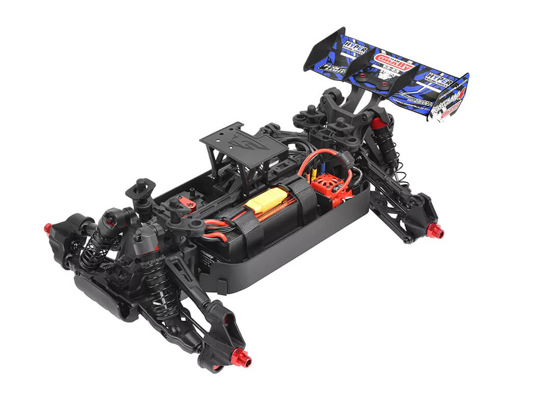 Its hybrid aluminum motor mount offers three motor positions for precise pinion alignment. The reinforced drivetrain, featuring steel outdrive cups and a sturdy 52T spur gear, ensures long-lasting durability. Wide hubs from the Kagama and Sketer wheels add stability and off-road capability, while a new wheelie bar helps manage the immense power. From the Kuron 725 brushless motor to the Torox 135 ESC, every component contributes to an exhilarating top speed of over 80 km/h. The CT2S 2.4GHz transmitter, chassis reinforcement system, and high-downforce wing complete the package, making the Kagama4 a true testament to Team Corally’s legacy of innovation and performance.