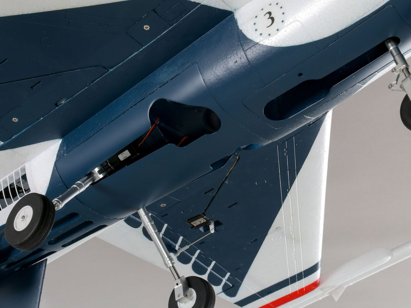 The E-flite® F-16 Thunderbirds 70mm EDF jet is a scale replica of the iconic aircraft flown by the U.S. Air Force Thunderbirds demonstration team. Like the full-scale airshow thriller, this F-16 has an incredibly wide performance envelope-from slow and stable high-alpha flight to amazing high-speed and vertical capabilities. At the core of this updated and upgraded version is a higher-performance 6S-compatible brushless motor plus an 85-amp ESC that are matched to a 12-blade fan to deliver an abundance of speed, thrust, and a turbine-like sound. Factory-installed electric retracts with shock-absorbing struts make it possible to take off from and land on a variety of surfaces, including manicured grass, while keeping ground handling smooth and delivering a realistic scale experience. The composite-reinforced EPO airframe is lightweight yet strong, and the digital, metal-geared servos plus ball-link equipped linkages provide precise control. And it all combines to deliver one of the easiest to fly, yet highest performance, most capable and feature-rich mid-sized F-16 models ever!
