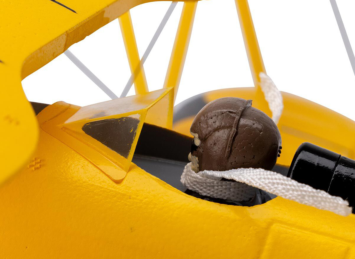 - Scale details including simulated flying wires and a pilot figure with a scarf