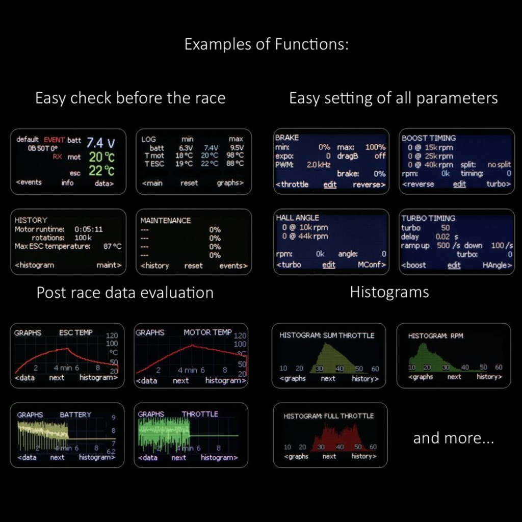 Easy programming: throttle, brake, boost and turbo timing, hall angle and many other functions.