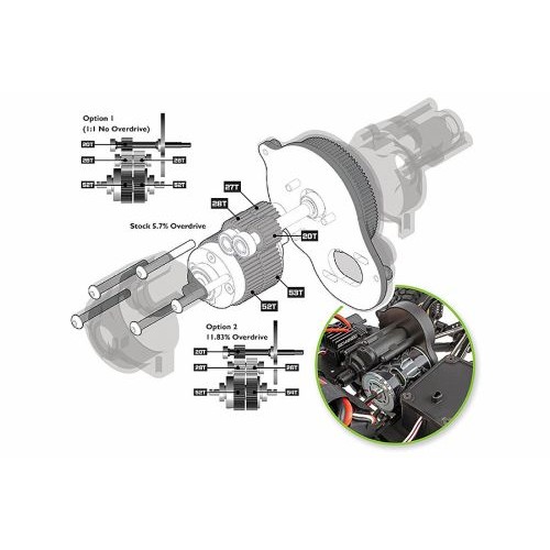 At the heart of the Enduro is our revolutionary Stealth(R) X gearbox. Although the exterior appears to have a conventional 3-gear transmission look, the inside is far from conventional. The Stealth(R) X features the ability to adjust the rear drive ratio independently from the front drive across three levels: stock overdrives the front end 5.7% (installed in RTR), option 1 provides a one-to-one drive ratio front-to-rear (available separately), and option 2 overdrives the front end 11.83% (included with RTR).