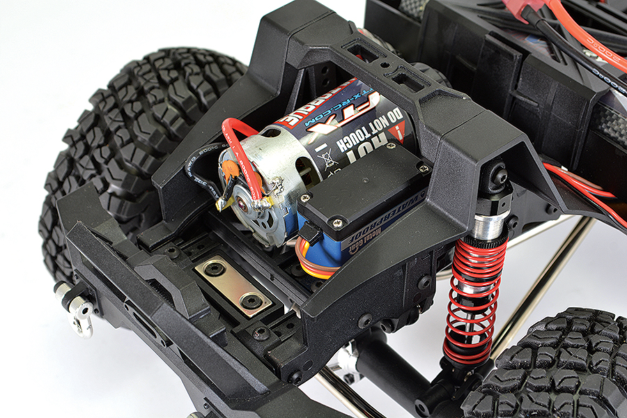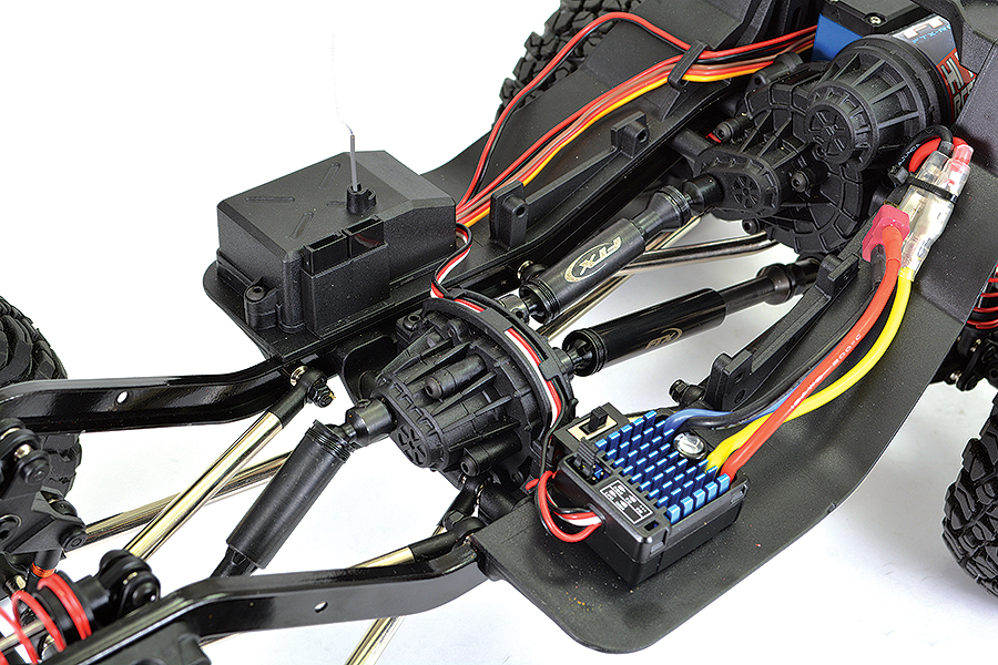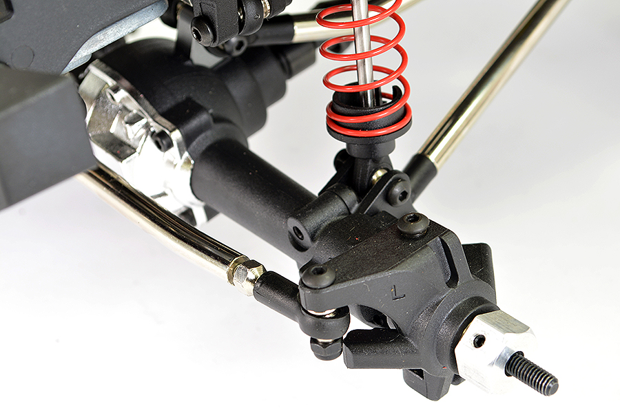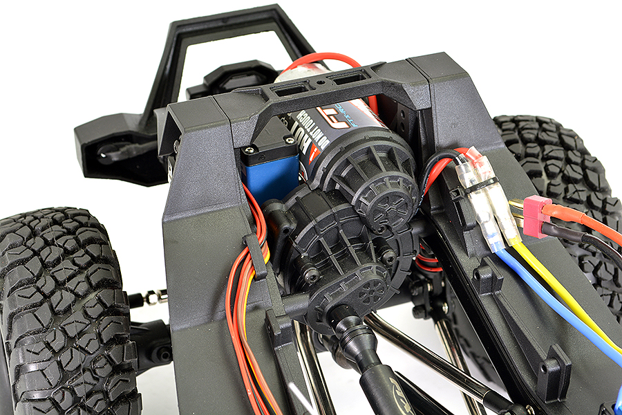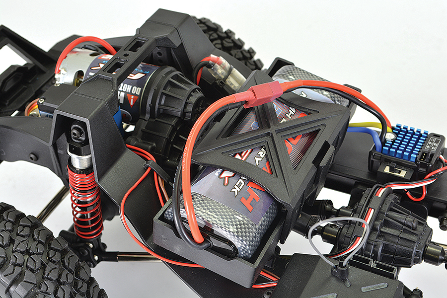 Aluminium CNC shock absorbers are standard front and rear as are dual rated front springs. With the battery pack mounted further forward and the motor and Etronix 15kg servo set directly over the axle, weight bias and climbing ability is greatly improved.