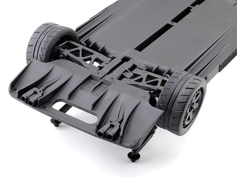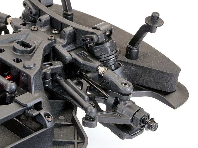 Oil filled shock absorbers, anti-roll bars and adjustable double wishbone suspension lets you tweak to suit your settings and tyre choice; either treaded rubber tyres for street racing, featuring 25mm wide front and 30mm wide rear for better stability at high speed or hard plastic boots on 6-spoke wheels for sideways drift driving.