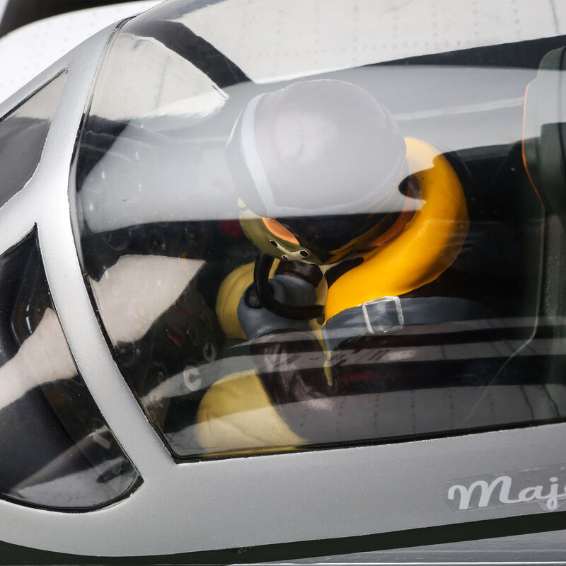 Beyond the factory applied satin-finish printed covering, other iconic details include airfoil-shaped tail surfaces, realistic engine exhaust, wing guns, gear doors, optional-use drop tanks, radio antenna, a 3D instrument panel and a painted pilot figure—just to name a few.