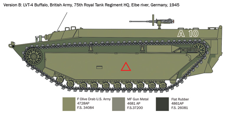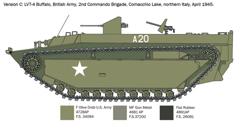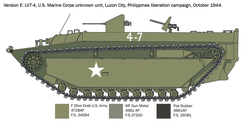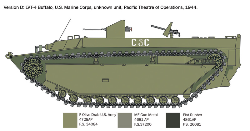 The L.V.T. tracked vehicles (an acronym for Landing Vehicle Tracked) were developed to equip the United States armed forces, including the Army and the Marine Corps, with a suitable vehicle for amphibious operations capable of providing a good level of protection. Often known as “Amtrac,” they were widely used in the Pacific theater against Japanese forces, as well as in the European theater during the last year of the war. The LVT-4, in particular, represented a significant improvement over previous versions. With the redesign, the engine was relocated to a central position, freeing up the rear of the vehicle for the addition of a ramp that allowed for the rapid loading and unloading of light vehicles or small-caliber artillery pieces to support landing troops. It was the most successful version with the highest number of vehicles produced.