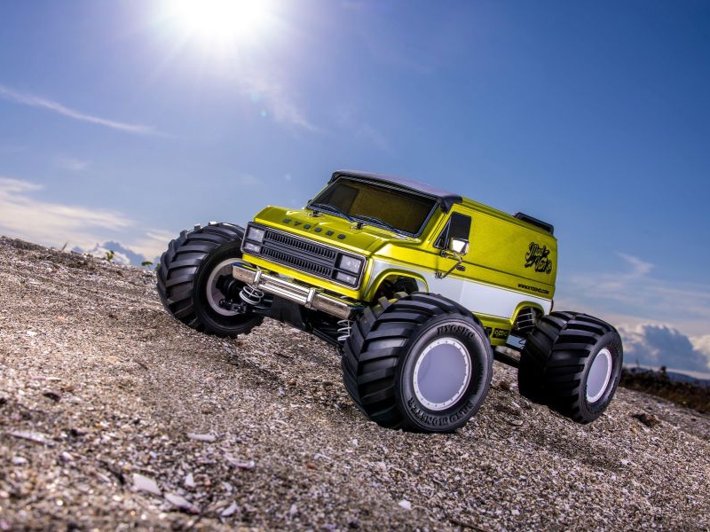 Pre-assembled chassis is sold as a Readyset including installed R/C system and pistol-grip transmitter. Battery for the chassis and charger are sold separately