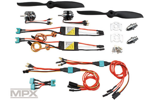 This power set gives the model ample performance, and provides sufficient thrust even for taking off from the ground. Rigging and de-rigging the model is quick and convenient with the cable set and special polarised connection board supplied in the set. This power set is the modern, high-performance alternative to the brushed motors previously used.Current drain with 3S LiPo battery and propeller supplied: approx. 28 A (2 x 14 A)