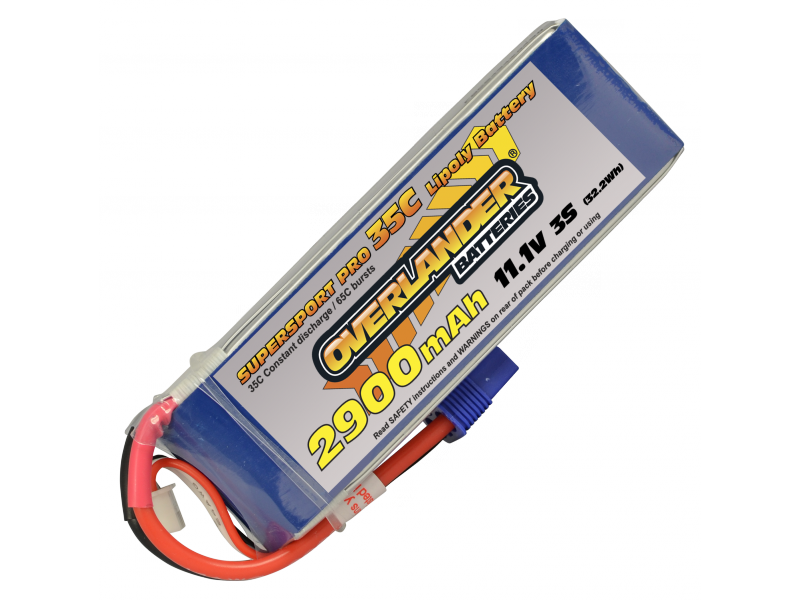 Lipo Batteries 2900mAh 3S 11.1v 35C Supersport EC3 Fully compliant LiPo batteries, choice of champions and record breakers! Supplied with EC3 connector – A perfect replacement and upgrade battery for the E-flight 350QX The best just got better. Overlander NEW Sport 2900mAh 3s 11.1v 35C is part of our Supersport range. All Overlander Supersport 35C LiPo cells are manufactured using the “STACKING” method, unlike many of the cheaper Chinese imports which are manufactured using the “WINDING” construction, a much cheaper construction method, with very limited discharge rates (15C – 18C) but often quoted as 25 – 30C. Stacking construction is known for its longevity, and gives stronger more reliable voltage. This Supersport pack has: • 2900 mAh • 3 LiPo Cells • 35C constant discharge All pack cells are fully matched 3 ways before assembly 1) Internal resistance 2) Voltage 3) Weight Giving you the same Overlander quality, passion and after sales service at a great value price. The Sport range is tried and tested, and recognised as offering consistent power and durability being used by enthusiasts new and old to the hobby with exceptional results this includes the Supersport 2900mAh 3s 11.1v 30C LiPo. Bullet points: • Overlander 35C Supersport • Lipo Battery Pack fitted with JST-XH balance plug • Superb value without the loss of performance • A real 35C product tested and proven • 35C continuous charge, 65C bursts • High quality silicone leads