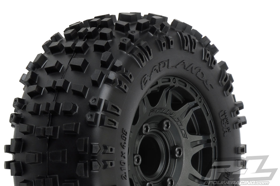 This is a pair of pre-mounted Badlands 2.8″ Tires. For all you Stampede® and Rustler® fans, the wait is over for an aggressive 5″ all-terrain tire! We take the guesswork out of your glue job by doing the mounting for you so you can spend your time having fun! The Badlands tire offers motocross style tread mounted on Raid Removable Hex Wheels. It is made strictly for the MX’er in you. Its oversized lugs offer you the ultimate in grass and dirt shredding performance under all-terrain conditions. The lugs are designed to ensure longevity while digging up the surface below. Made from durable M2 (Medium) compound, the Badlands tire is poised for battle and ready to take your 1:10 truck to the next level.