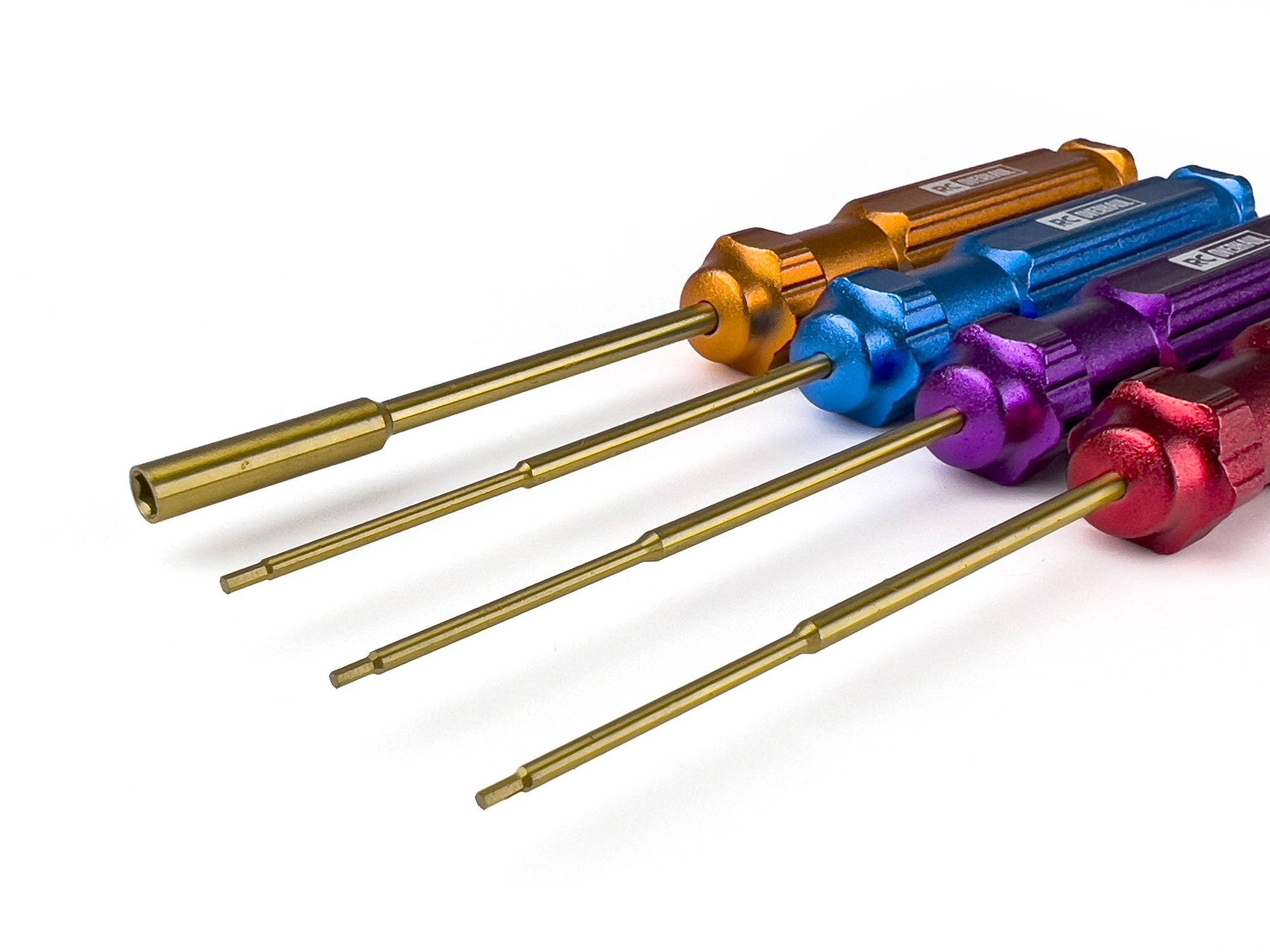 For those with the Axial SCX24 platform a small tool set make proper maintenance and upgrading this tiny crawler a breeze! This set includes an imperial 0.050″ hex driver for the tiny screws and a 1.3mm and 1.5mm metric hex drover for some of the ‘larger’ screws as well as a 4.0mm nut wrench to get the wheels off. It’s a small set that has it all and with the individually anodized colour handles it is easy to pick out the right tool for the job at a glance. Ergonomic and lightweight that are ideal for hours of tinkering and with the size and ‘RC Overhaul’ logo laser etched on the handle they look smart. This is an essential for any SCX24 platform owner, ensuring sure you have the right tools for the job.