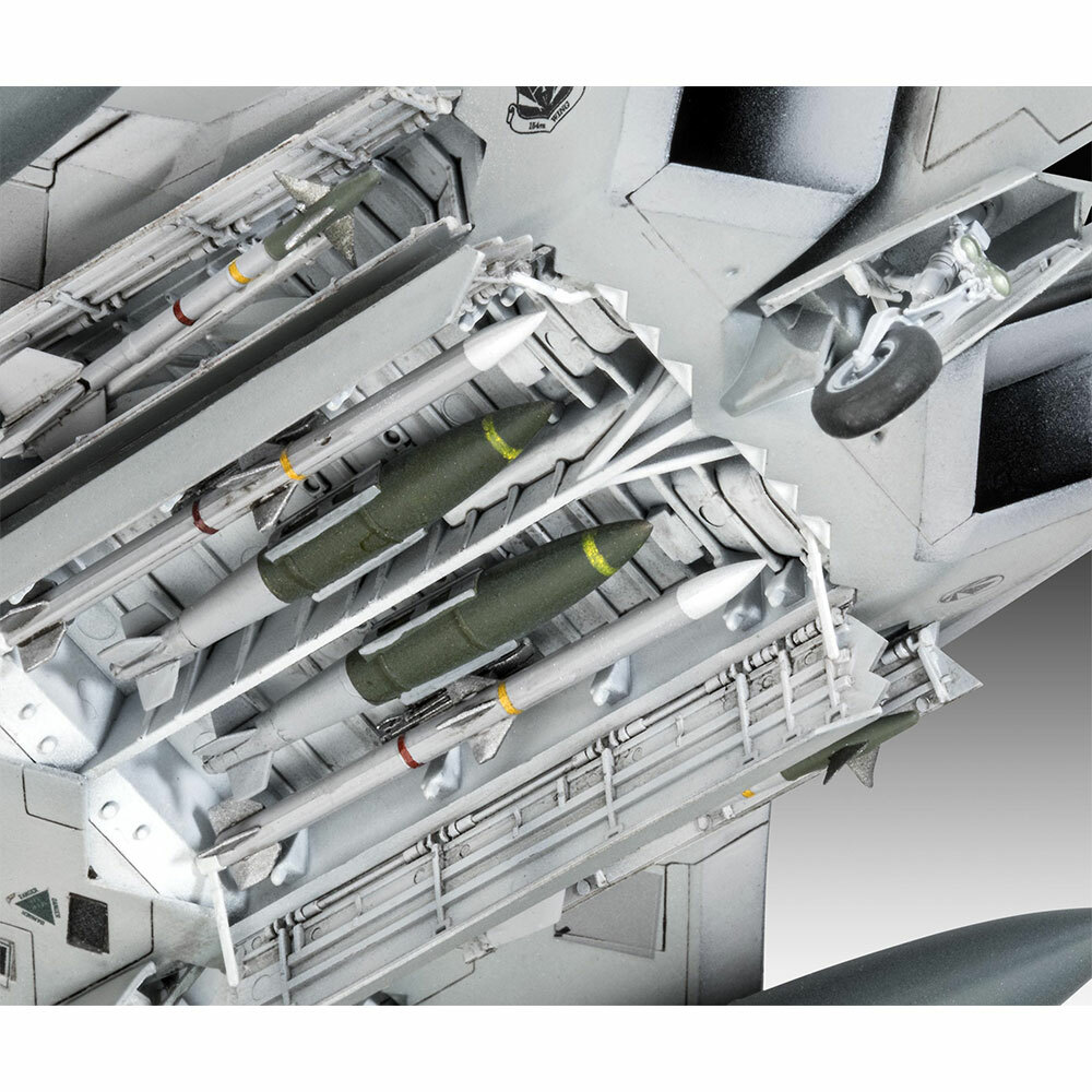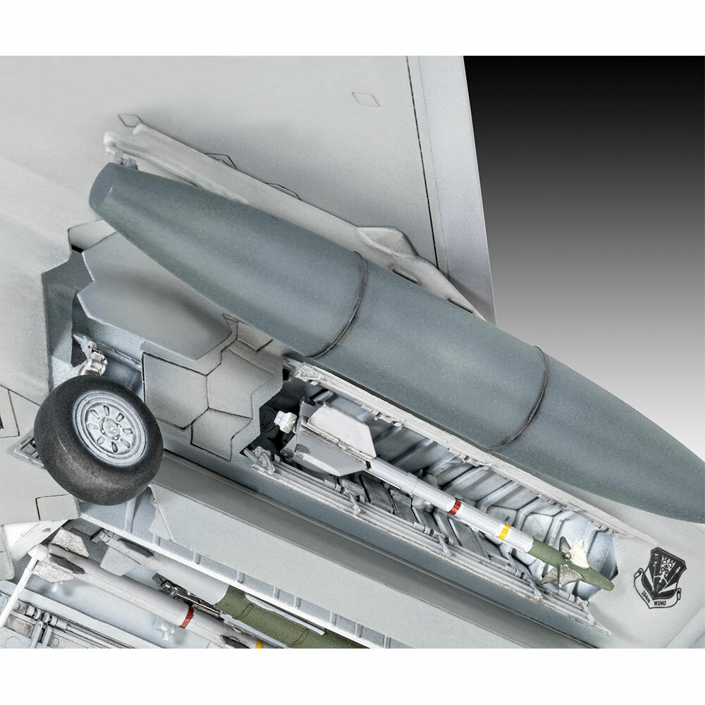 In addition to the non-assembled model, the kit includes illustrated, multilingual building instructions as well as decals to personalize your model. In addition, you get a detailed cockpit, detailed landing gear, detailed air intake and thruster area, three detailed weapon bays, additional tanks and two GBU-32 bombs for ultimate building pleasure.