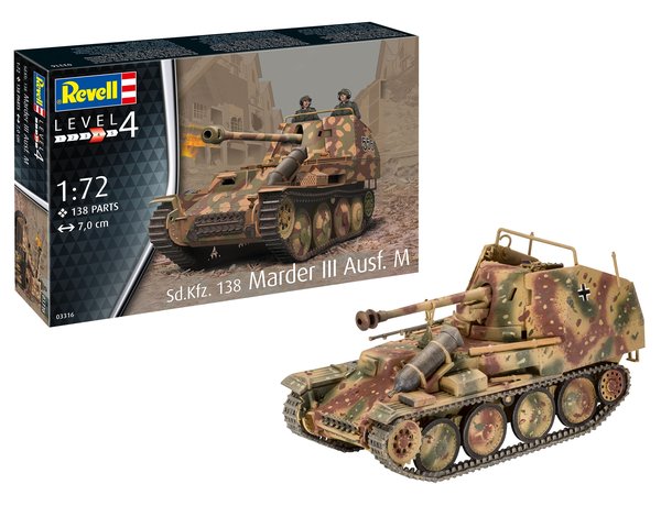 The Revell SD.KFZ. 138 Marder III AUSF. M 1/72 03316 from the plastic model kits range accurately recreates the real life German SPG. This model requires paint and glue to complete.