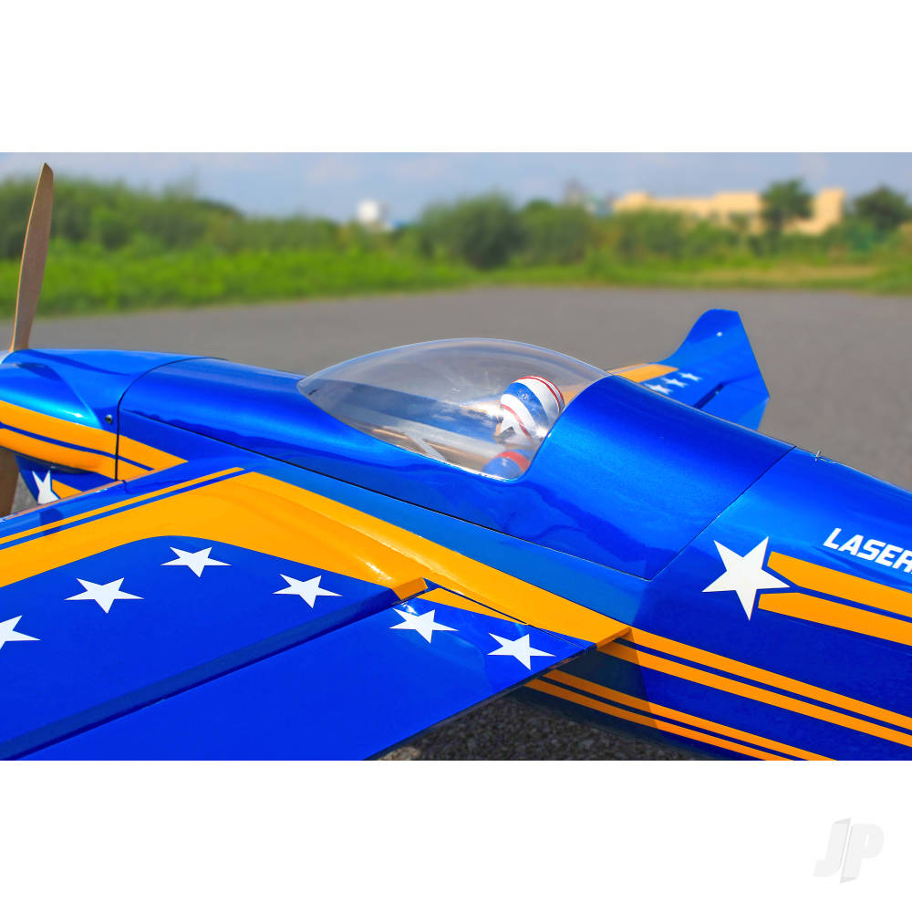 The laser features high-quality hardware, a pull-pull rudder control system, robust carbon undercarriage and a factory-painted fibreglass cowl. It’s a stunning model, designed for 35–40cc petrol engines or equivalent high-power electric setups. Control authority is exceptional thanks to large surfaces, while the airframe remains stable and predictable through all the aggressive manoeuvres that you’d expect it to be capable of.