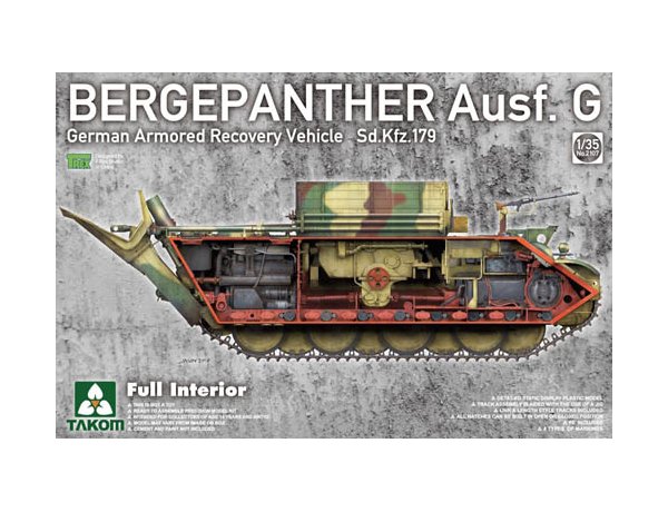 The Takom 1/35 Bergepanther Ausf G w/interior from the plastic tank model kits range accurately recreates the real life WWII tracked German engineering vehicle. This model requires paint and glue to complete.