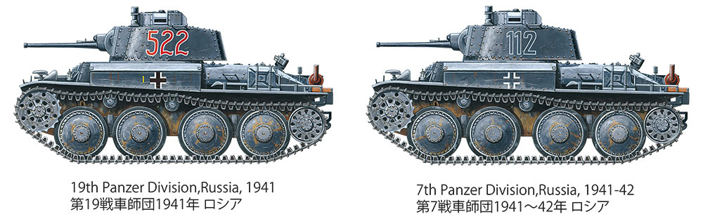 ★This is a 1/35 scale plastic model assembly kit. Length: 132mm, width: 62mm. ★The 38(t) form with riveted armor plate is accurately depicted. ★Parts are included to recreate fender-top stowage boxes that were often added by units on the front line. ★Assembly type tracks feature single-piece straight sections for fine reproduction of upper run ‘sag.’ ★Engine grille mesh is rendered faithfully using a photo-etched component. ★Comes with a commander figure for installation in the hatch, and two Eastern Front marking options.