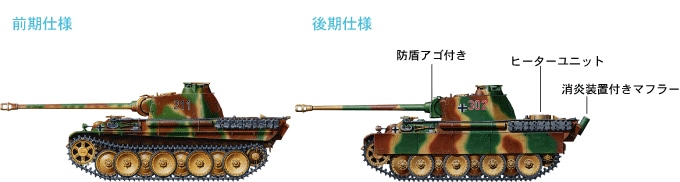 ★1/48 scale assembly model of the Panther Ausf.G tank. ★Rich variety of optional parts allows construction of early or late version Panther G. ★Choice of two types of mantlet, with or without lower lip piece. ★Install muffler with or without flash suppressor. ★Reproduces heater unit used for winter operations. ★Assembly type tracks with straight upper and lower parts made of single pieces. ★Choice of 4 sets of markings