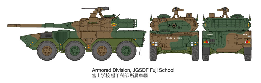 This scale model assembly kit recreates the Japan Ground Self Defense Force (JGSDF) Type 16, which reached units beginning in 2017. An 8-wheel vehicle, the JGSDF classify it as a Maneuver Combat Vehicle (MCV), a highly mobile and well-armed vehicle intended to provide supporting fire and take on enemy armor as a part of rapid response units. Its domestically designed L/52 105mm rifled gun is a low-recoil piece with perforated muzzle brake and a fire control system to enable accurate firing on the move. Rolled steel turret and hull employ modular and spaced armor estimated to be able to survive frontal hits from 20-30mm class guns and portable anti-tank weapons. Thanks to its 570hp engine, the 26-ton Type 16 has a top speed of around 100km/h and significant range; it looks set to provide a major boost to JGSDF units as its rollout continues.