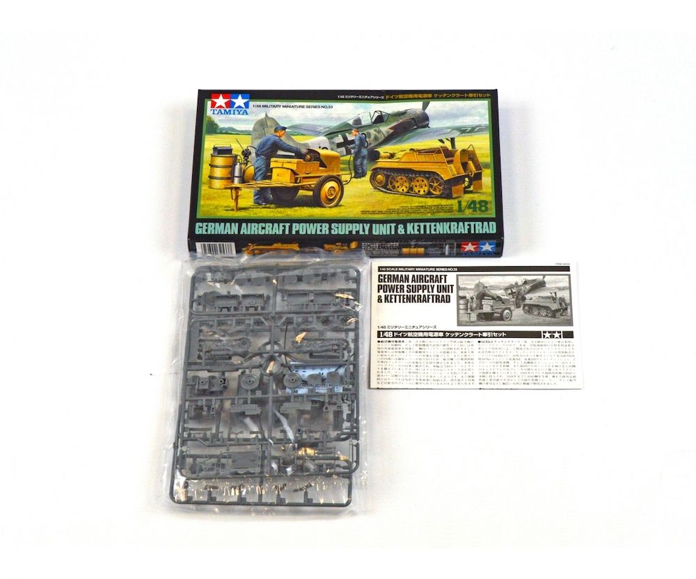 Detailed 1/48 assembly model of the German Kettenkraftrad w/Aircraft Power Supply Unit. ★Length: 53mm、Choice of open or closed unit cover allowing display of fully detailed generator interior. ★Includes tool box, fire extinguisher and drum with pump as accessories to add realistic diorama detail. ★Comes with 2 engineer figures in lifelike poses. ★Match with 1/48 scale WWII German aircraft to recreate scenes from airbases.