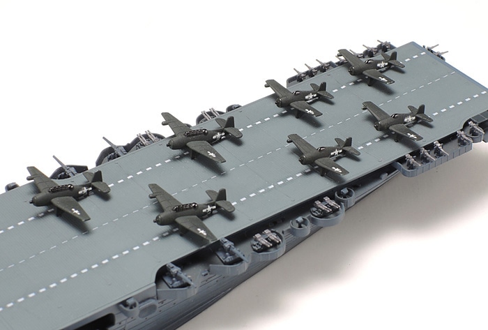 This is a plastic model assembly kit of the U.S. aircraft carrier CV-3 Saratoga. It depicts her as she appeared in the Battle of Iwo Jima in February 1945. ★Length: 396mm, width: 55mm. ★The slim-line form originally intended as a battle cruiser is recreated in left and right side hull pieces. ★The flight deck is molded in a single piece, including details such as arresting wires, and the central guide rails used for moving seaplanes. ★The starboard side bulge gave the Saratoga an asymmetrical form which is faithfully captured by the model. ★Large starboard funnel and bridge to its fore are also realistically replicated. ★The model is packed with details, including recreations of the Mk.37 gun director, SK radar antenna and funnel-front SM radar, plus 40mm quadruple and 5-inch gun positions, and even lifeboats! ★Waterline plate is attached as an integrated part of the hull. ★Decals are provided to recreate lines and deck-top markings for a highly effective finish. ★Parts to recreate four each of Avenger fighter and Hellcat bomber aircraft with radar pods are also included.