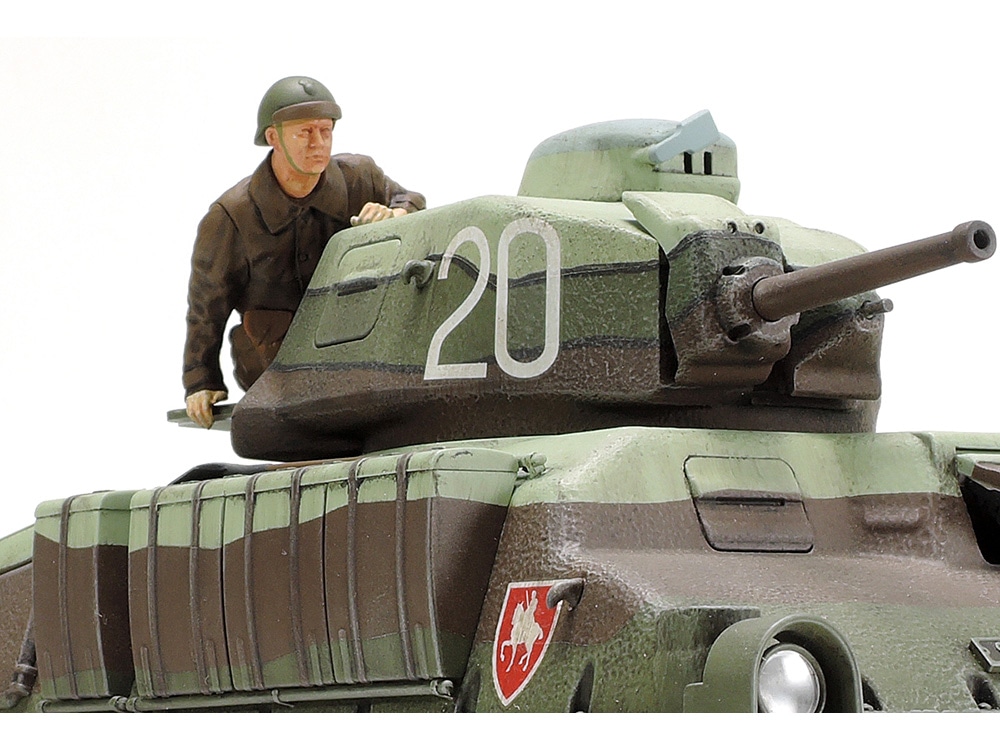 This is a 1/35 scale plastic model kit of the SOMUA S35. Length:153mm, Width: 63mm. ★Extensive measurement of a real SOMUA S35 led to this highly accurate recreation of the rounded cast metal hull and turret. ★Features realistic depictions of cast metal surfaces. ★Intuitive parts layout efficiently captures the bogey suspension and side armor plates with aplomb. ★Link-type assembly tracks provide excellent realism. ★Comes with a commander figure to be positioned in the turret, plus 3 marking options and color camouflage pattern reference illustrations.