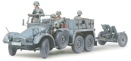 ★1/35 scale ★Overall length: 250mm ★Every characteristic of this truck such as the low-profile bonnet, the chassis, the ammunition boxes and the crew seats on the rear part, as well as the spare wheel for the anti-tank gun has been realistically reproduced. ★A 3.7cm Pak anti-tank gun and various accessories are part of the set. ★4 all-new figures and decals for 4 different markings are included.