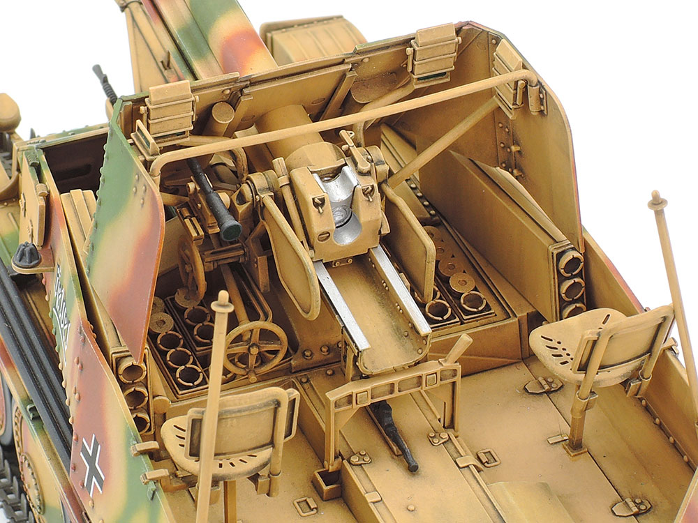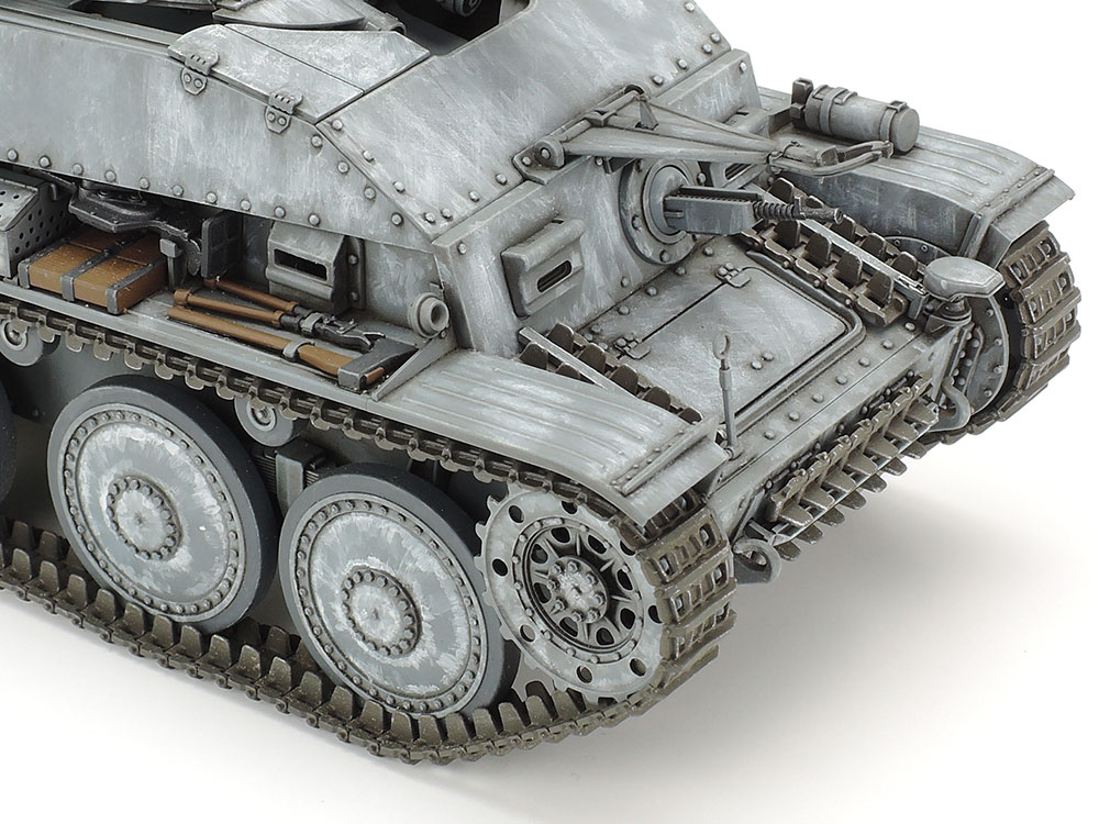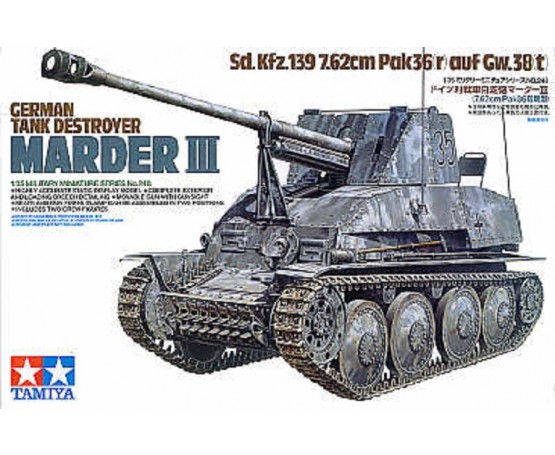 ★1/35 scale plastic assembly model kit based on the German Tank Destroyer Marder III. ★Overall length: 174mm ★Each detail of this fascinating fighting machine has been accurately reproduced for total modeling satisfaction. ★All the details of the fighting compartment (main gun plate, gun supports, ammunition rack, etc.) have been precisely recreated. ★Protective armor and sighting equipment moves with raising and lowering of main gun. ★Crew seats and large clamp for main gun can be modeled in the fighting or moving positions. ★Two crew figures are included in set. Five kinds of battlefield markings are included.