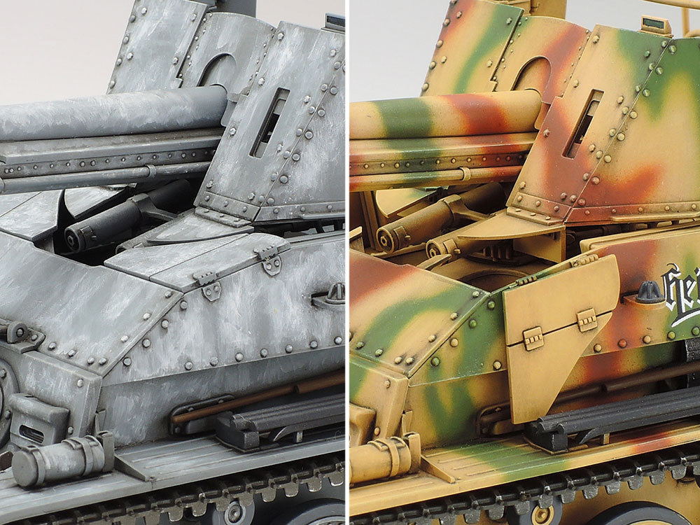 In the summer of 1941, Germany’s invasion of Russia was unfolding favorably for the Wehrmacht. However, German authorities began to notice the inferiority of their tanks and anti-tank weaponry to those of the Soviet army, such as the T34. To cope with this disparity they decided to: improve the Pz.Kpfw.III and Pz.Kpfw.IV tanks; develop new tanks; and increase production of the 7.5cm anti-tank cannon. Finally, as an interim solution, it was decided to improve captured Russian 7.62cm anti-tank cannons and deploy them for Wehrmacht use. These fearsome cannons could penetrate 83mm armor plating at a range of 1000m, but after improvement, could penetrate up to 122mm, and were renamed the 7.62cm Pak36(r) gun. Until the new tanks were ready for deployment, 7.62cm Pak36(r) guns were to be mounted on the chassis of obsolete Pz.Kpfw.II and Pz.Kpfw.38(t) tanks for the creation of a stopgap tank hunter. The 38(t) tanks were based on the LtVz.38 tank, which was developed for use by the Czech company CKD (later BMM) for the Czech army in 1938. In 1939, with the annexation of Czechoslovakia, this tank went into production for the Wehrmacht. The base Czech-made tank was combined with the Soviet 7.62cm Pak36(r) gun, resulting in the creation of the Wehrmacht’s fearsome tank hunter, the Marder III Sd.Kfz.139. The turret base of the Pk.Kpfw.38(t) was removed and a 16mm steel plate was attached in its place. The Soviet 7.62cm Pak36(r) gun was mounted on that plate, 11mm armor plating installed to the front and sides, and massive stirrups immobilized the gun.