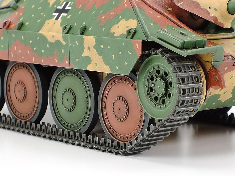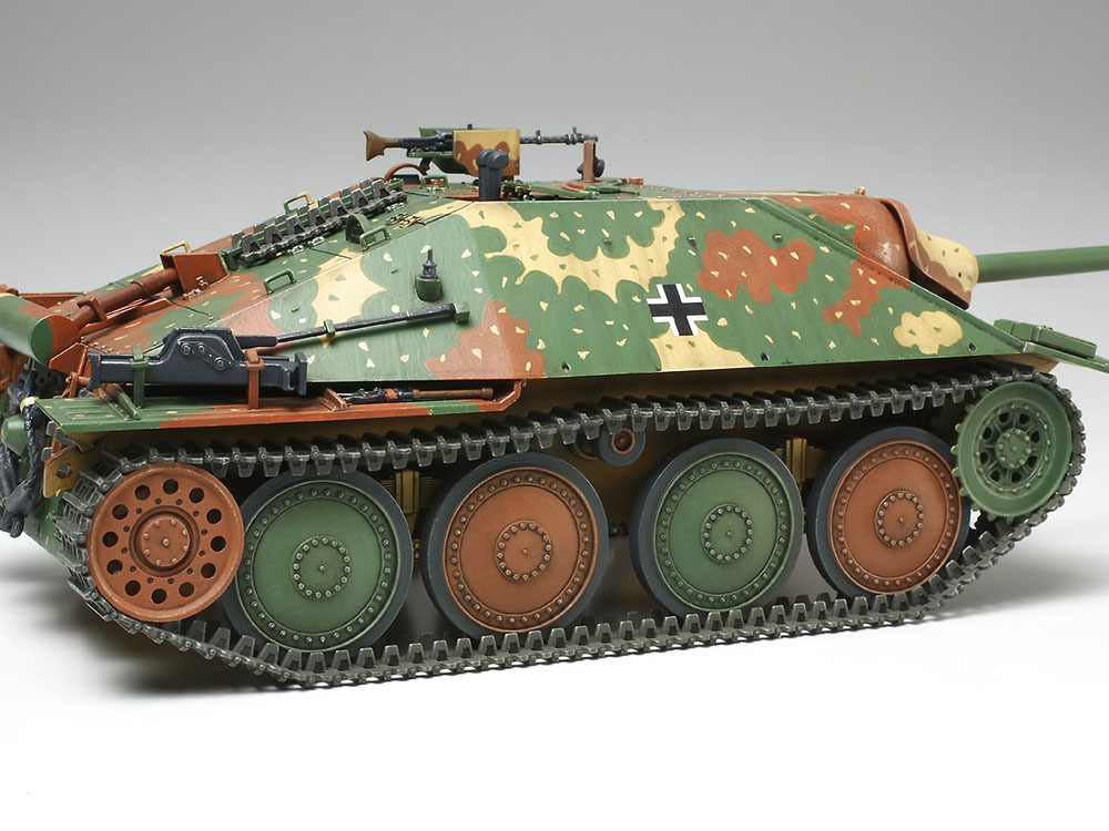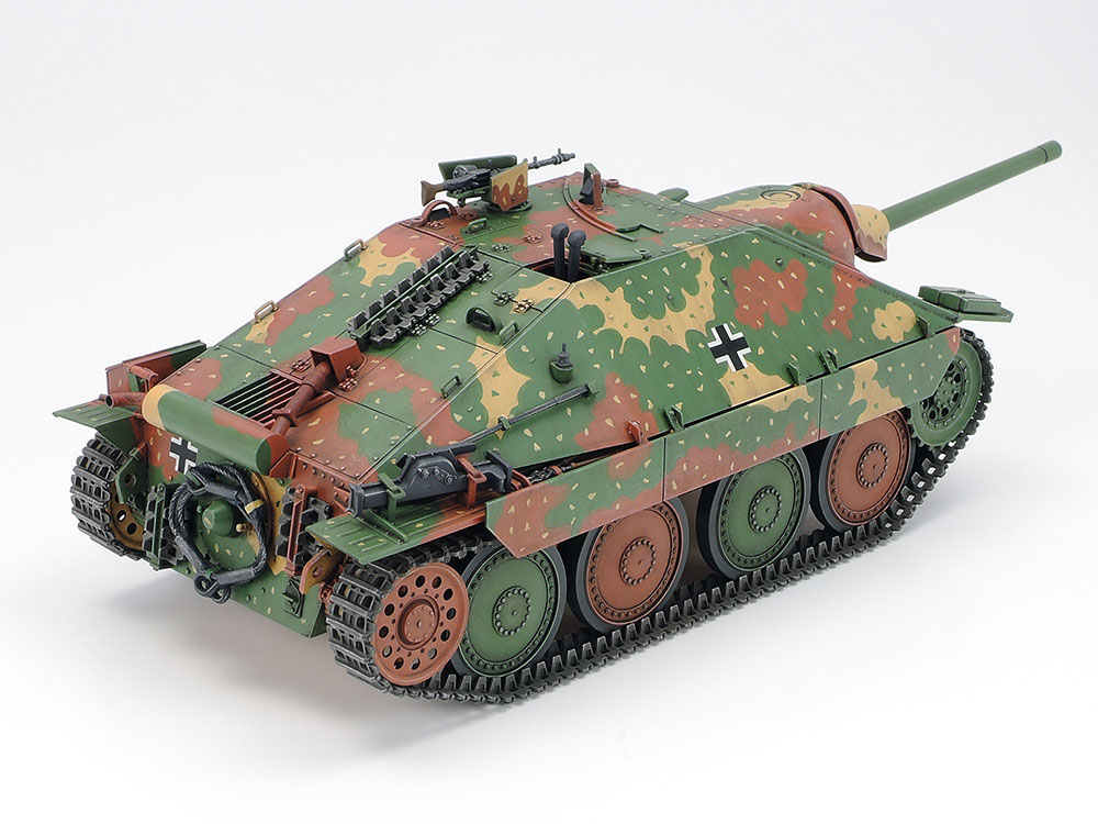 From the middle stages of WWII, Allied tank designs showed steady improvement and featured greater firepower and armor protection. Under these circumstances, the German army increasingly depended on turretless tank destroyers armed with a powerful gun on a limited-traverse mount. Among these was the Hetzer, a compact tank destroyer based on the Czech-made 38t tank chassis that had 60mm sloped frontal armor and a 75mm main gun. Entering service from July 1944, the Hetzer’s low sihouette and powerful armament made it a respectable adversary on both the Eastern and Western fronts. Approximately 2,800 Hetzers of different variants were produced, and they also served with the Czech and Swiss armed forces after the end of WWII.