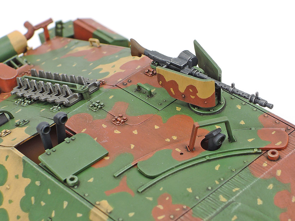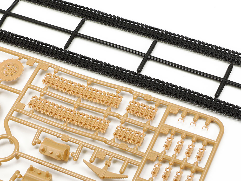 ★Length: 180.5mm ★Distinctive Saukopf gun mantlet and armored mantlet cover accurately reproduced. ★Remote controlled machine gun mount features precision-made parts and polycap installation, enabling free rotation even after assembly. ★Gun sight, periscopic binoculars, and jack also included for additional hull detail. ★Drive sprockets, guide wheels, and road wheels all feature meticulous surface bolt details. ★Choose from 2 types of accurate caterpillar tracks, assembly type and belt type. ★Includes 1 standing commander figure, 4 types of markings, and a full color painting guide.