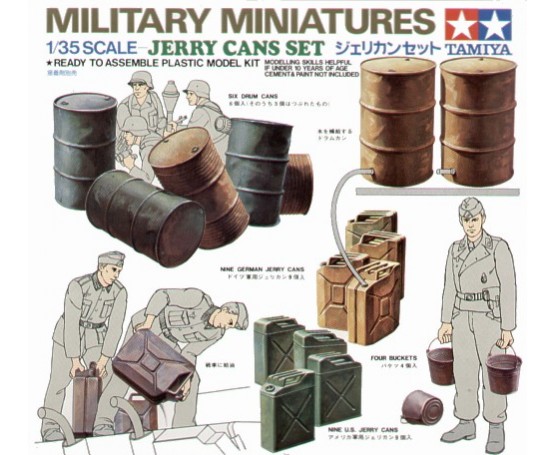 This is a 1/35 scale plastic model assembly kit recreating various jerry cans, barrels and other containers. ★Use them to add extra life to your diorama creations, placing them upon AFVs or in the hands of figures. ★Includes nine each of U.S. and German type jerry cans, plus three each of new and dented barrels.