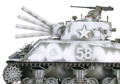 Excelling in both reliability and sheer production capability, the M4 Sherman series of tanks became the staple fighting-vehicles of the WWII Allies. The first version to be produced, the cast-hull M4A1, was succeeded by the welded-hull M4, the diesel engine M4A2, and finally the most widely-known tank of the series, the M4A3. Three types of main armament were used on the M4A3: on the initial production types, the 75mm main gun and on the subsequent types, the 76mm main gun for heightened penetration. Finally, to provide heavy fire support for assaults on enemy outposts, the powerful 105mm howitzer was later adopted. The 105mm howitzer was carried in a M52 combination mount and a vision cupola was fitted for the commander with a small hatch for the loader. It could fire M1 shells at angles from -10 to +35 degrees at a maximum range of 11,500m. About 500 of the M4A3 (105mm) were produced at the Chrysler factory in Detroit from May to September 1944. From September 1944 horizontal volute spring suspension was introduced on the M4A3 (105mm) together with the wider center-guide T66 tracks. The M4A3 (105mm) were deployed to European Theatre from July 1944, and played an indispensable role in the destruction of enemy positions by the U.S. infantry fighting on the front lines.