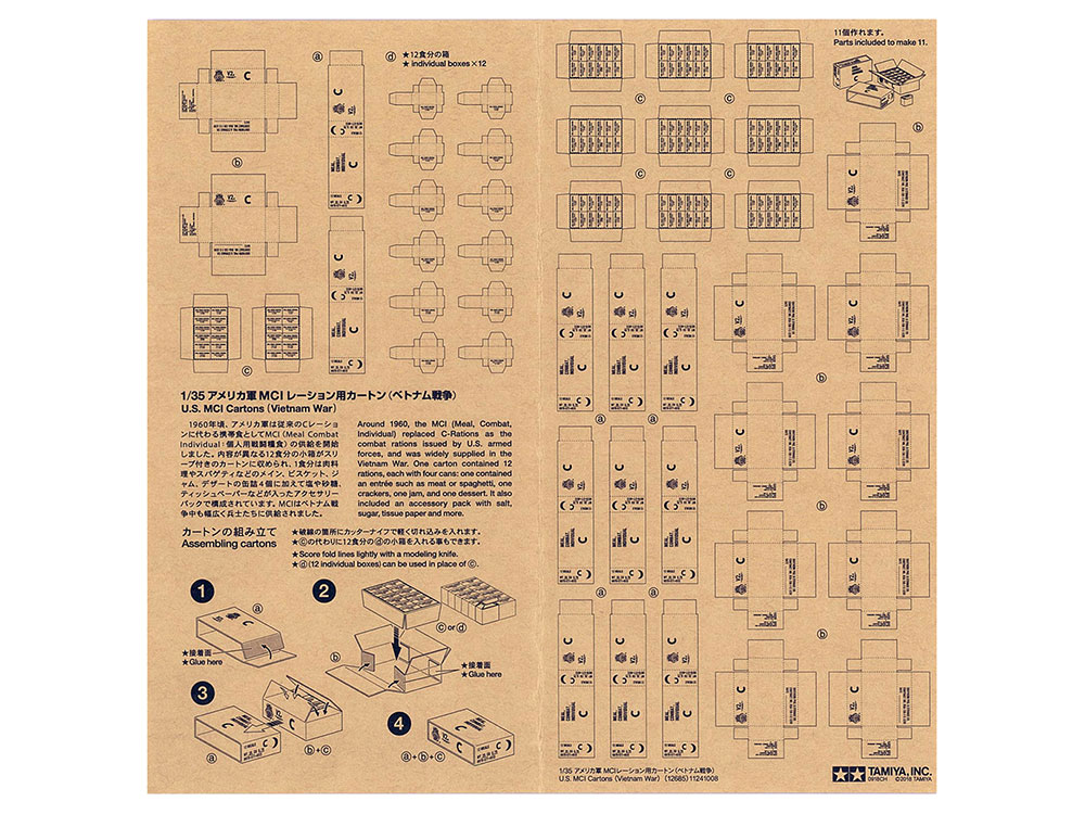 ★The MCI (Meal, Combat, Individual) was a familiar sight for U.S. troops in the Vietnam War. Each carton came in a sleeve and contained 12 rations. ★Sleeves and cartons are recreated using separate parts. ★Parts are contained to recreate 11 cartons. ★Carton dimensions when assembled: 200mm x 195mm.