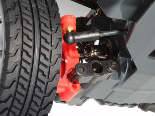 Based around a tough monocoque frame with integrated gearboxes, this compact 4WD chassis gives a thrilling drive whether you take it on road or flat dirt surfaces. It features a rear-mounted motor, with gear-driven rear wheels and a propeller shaft taking power to the front. Both front and rear gearboxes have differential gears. The battery pack location in the chassis center secures excellent balance, while 4-wheel independent double wishbone suspension employs friction dampers. Off-road capable M-05Ra chassis uprights and hub carriers are also included.