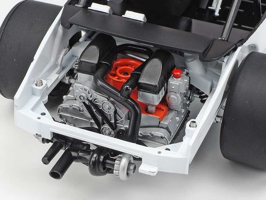 • The horizontally opposed 6-cylinder DOHC engine and interior are authentically recreated. Removable engine hood reveals a view of engine components even after assembly.