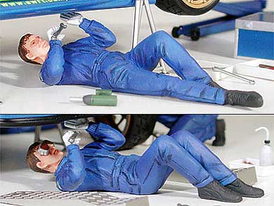 Tamiya introduces a set that’s perfect for creating the ultimate rally diorama. 5 figures total are included (4 mechanics and one driver). Mechanics have been designed in a variety of posses: two are laying under car and two are kneeling by wheels. Driver figure is in a pose that depicts him giving orders to mechanics. Includes parts for replication of tools such as car jack, stand, sloped board, toolbox, part box, impact wrench, and spanner. Decals for 2001 or 2002 season Subaru and Peugeot mechanics are provided.