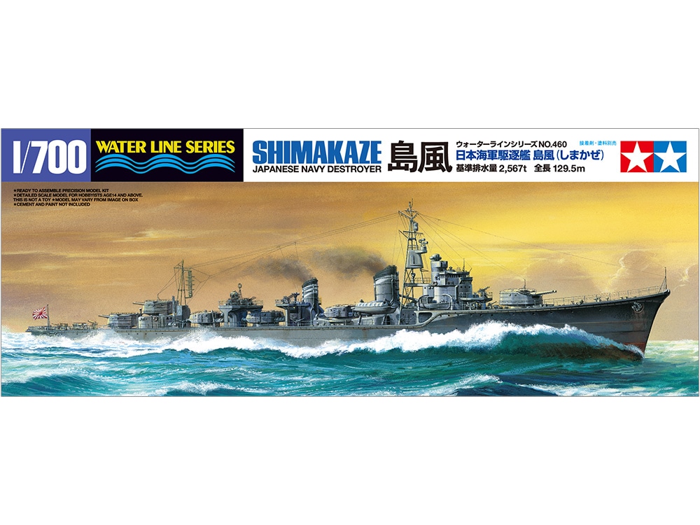 ★This is a 1/700 scale plastic model assembly kit of the Japanese Navy Destroyer Shimakaze. Length: 185mm. ★The slimline hull is recreated using left and right halves. ★Separate deck parts feature exquisite molding, with details such as anchor chains. ★Slide-molded 12.7cm twin gun turret depictions offer excellent accuracy. ★Main guns and quintuple torpedo tube mounts are assembled using poly caps to allow their rotation. ★Features a faithful rendering of the bridge and mast. ★Decals are included in the kit to recreate linoleum deck sections and more. ★The model finishes at the waterline, allowing recreation of the Shimakaze at sea.