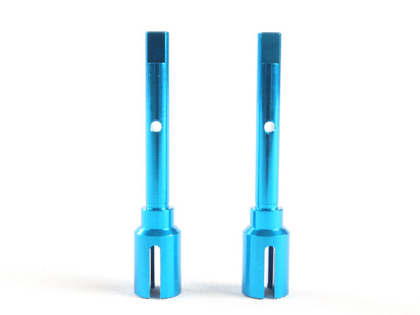 These Tamiya blue anodized aluminum front and rear propeller joints are option parts designed for the TT-02 chassis. Like the TT-02 Aluminum Propeller Shaft (Item 54501), they reduce the power lost in the transmission from the stock resin parts.