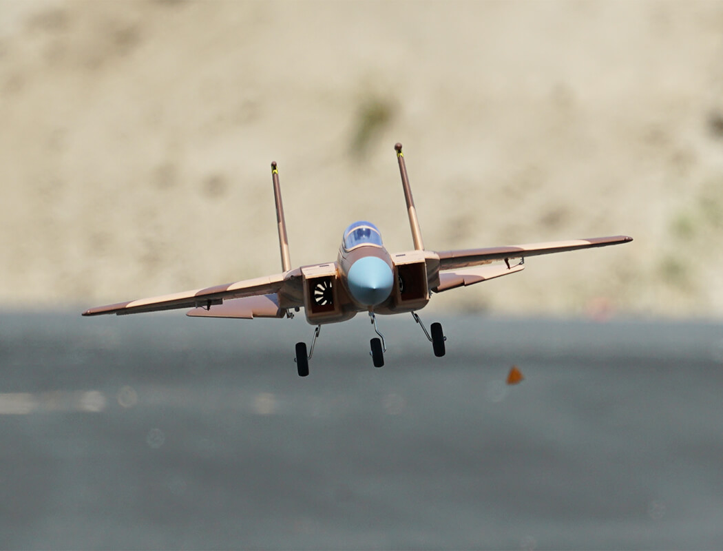 The factory-installed power system, including twin efficient 1413-KV5500 brushless motors and twin 20A brushless ESCs, paired with a 4S LiPo battery, delivers an abundance of thrust for fast climbs, rolls, loops and endless fun for high alpha flying due to the F-15’s low wing load and full flying stabs. A flight time of around 3-8 mins can be achieved with proper throttle management.